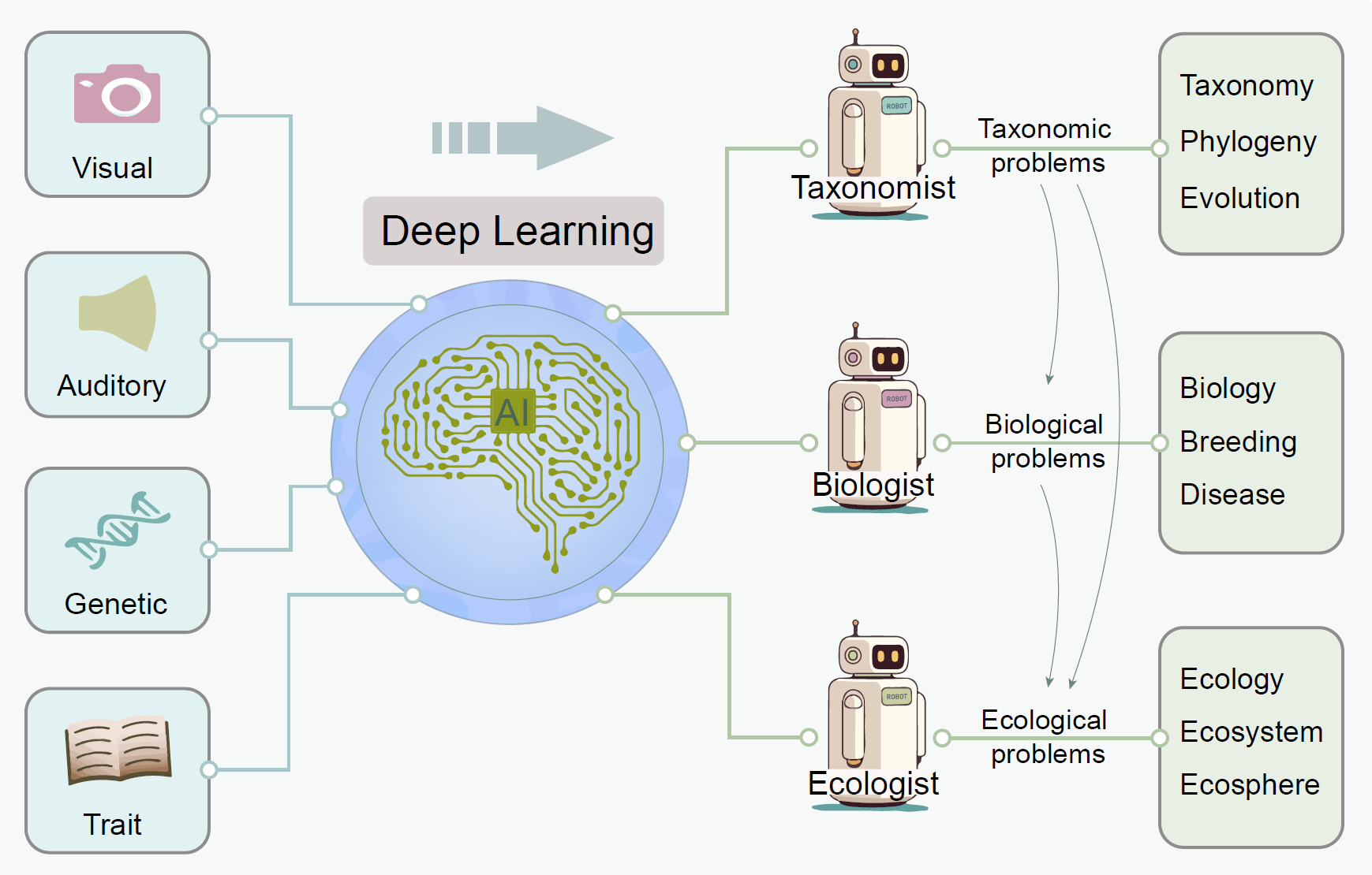 圖1 深度學(xué)習(xí)在生物圖像、聲音、基因序列與性狀特征等方面的應(yīng)用