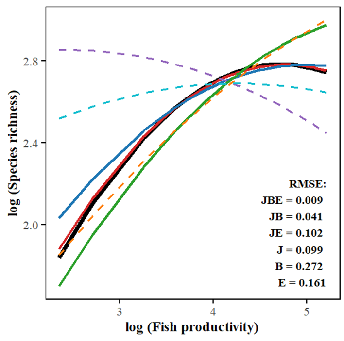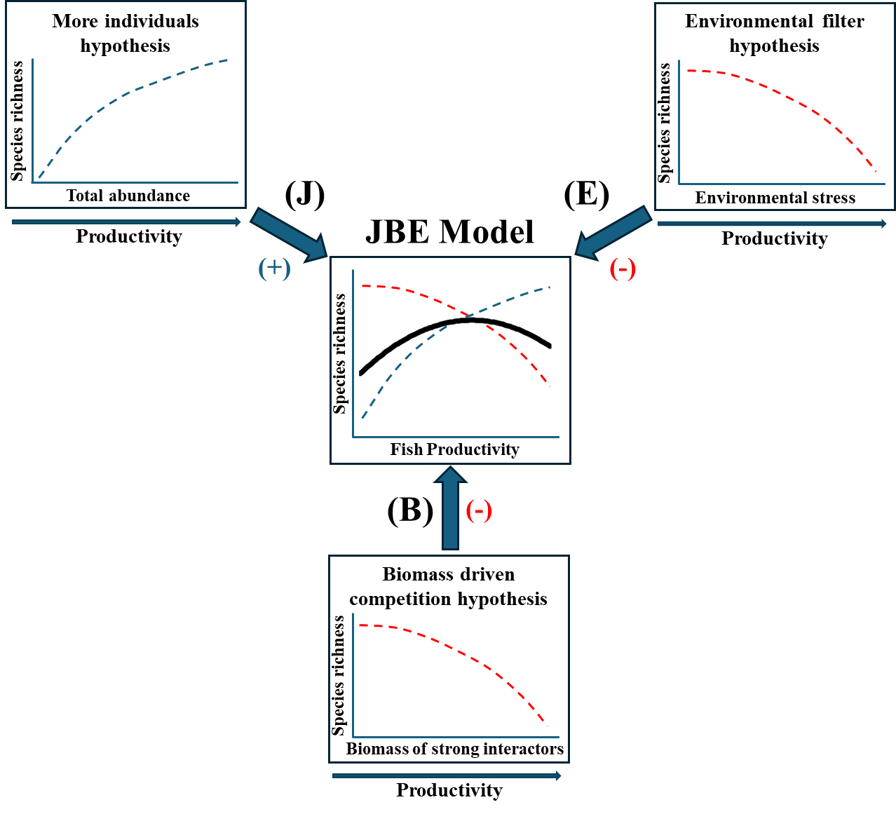 本研究首次提出了一個(gè)新的統(tǒng)一模型(JBE模型),創(chuàng)新性地整合了圍繞該科學(xué)問(wèn)題的生態(tài)學(xué)三大核心假說(shuō)——“更多個(gè)體假說(shuō)(More Individuals Hypothesis,J)”、“生物量驅(qū)動(dòng)競(jìng)爭(zhēng)假說(shuō)(Biomass-Driven Competition Hypothesis,B)”與“環(huán)境過(guò)濾假說(shuō)(Environmental Filter Hypothesis,E)”。該模型以極簡(jiǎn)而嚴(yán)謹(jǐn)?shù)姆绞?,將觀測(cè)模式、生態(tài)理論與統(tǒng)計(jì)建模緊密結(jié)合,成功重建了湖泊魚類群落中觀察到的單峰關(guān)系,為長(zhǎng)期困擾生態(tài)學(xué)界的“生產(chǎn)力–多樣性難題”提供了可量化、可驗(yàn)證的機(jī)制解釋。