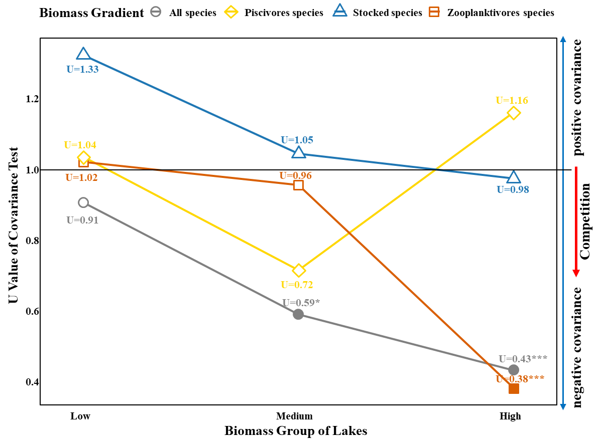 研究發(fā)現(xiàn),在高生產(chǎn)力湖泊,浮游動(dòng)物食性魚類的生物量顯著增加,競(jìng)爭(zhēng)作用顯著增強(qiáng),從而導(dǎo)致其他物種被排除。競(jìng)爭(zhēng)驅(qū)動(dòng)的物種損失先于環(huán)境脅迫(如缺氧)引發(fā)的多樣性下降,并抵消了高豐度帶來(lái)的潛在物種增加效應(yīng)。這表明,生物多樣性下降可能是生態(tài)系統(tǒng)退化的早期預(yù)警信號(hào)。該研究不僅深化了對(duì)湖泊生態(tài)系統(tǒng)結(jié)構(gòu)穩(wěn)定性的理解,也為中國(guó)“十年禁漁”背景下的湖泊生態(tài)保護(hù)修復(fù)與管理提供了重要理論依據(jù)——湖泊管理不應(yīng)僅僅追求魚類資源量或物種數(shù)目的提升,而應(yīng)更多關(guān)注生產(chǎn)力與多樣性之間的動(dòng)態(tài)平衡與生態(tài)權(quán)衡機(jī)制。