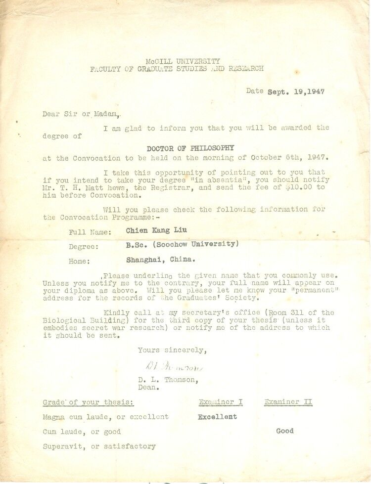 劉建康院士博士學(xué)位相關(guān)信件(劉院士女兒劉軍捐贈)