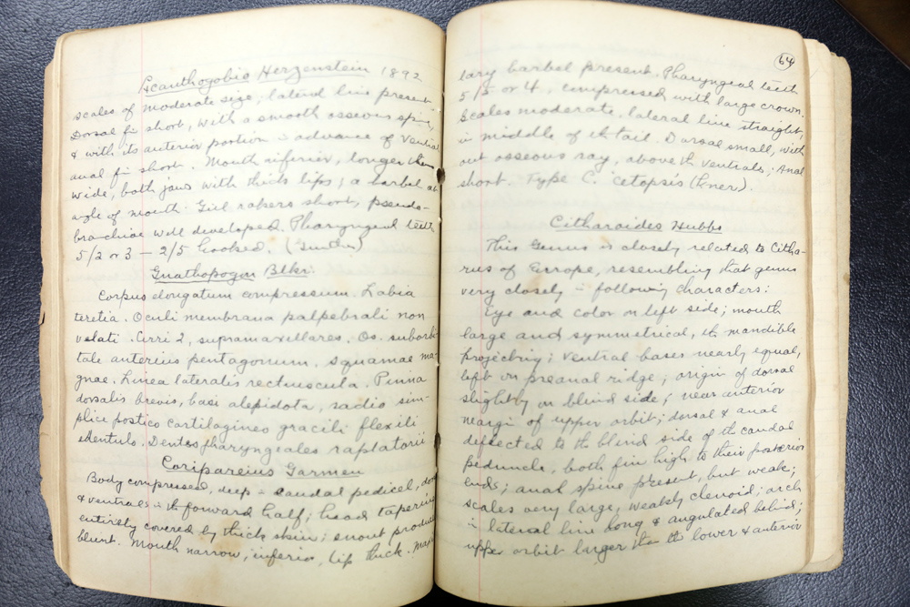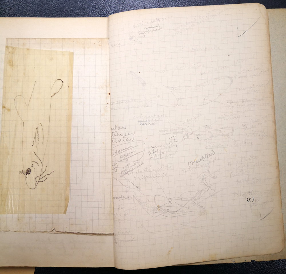 1999年的夏天,水生所老標(biāo)本館2樓有幾間辦公室正在清理,樓梯轉(zhuǎn)角處有一些文件堆積著,準(zhǔn)備處理掉。,作者在這片廢紙堆中,發(fā)現(xiàn)了這個(gè)筆記本,看得出來(lái),這個(gè)筆記本有些年頭了,紙張略微發(fā)黃,但是上面的外文筆跡還很清晰。這個(gè)筆記本的主人是誰(shuí)呢?作者拿著這個(gè)筆記本請(qǐng)教了標(biāo)本館的樂(lè)佩琦老師、羅云林老師、陳煒老師等人,他們一致認(rèn)出了筆跡,原來(lái)這是我們水生所的老所長(zhǎng),開(kāi)所三老之一的伍獻(xiàn)文先生的筆記本。這是當(dāng)年伍獻(xiàn)文老先生在法國(guó)巴黎自然歷史博物館攻讀博士學(xué)位時(shí)候留下的筆記。