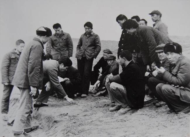 華元渝(左側(cè)用手在地上比劃者)給漁民隊(duì)伍講解捕豚步驟