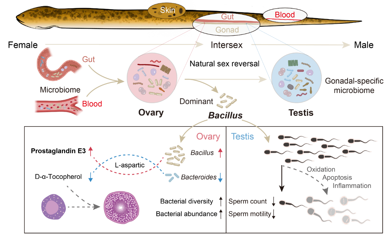 該團(tuán)隊(duì)報(bào)道了黃鱔卵巢和精巢中的細(xì)菌微生物群落特征,通過(guò)與腸道、皮膚和血液三個(gè)不同生態(tài)位中微生物群落進(jìn)行比較分析和溯源,發(fā)現(xiàn)了黃鱔性腺菌群主要來(lái)自于腸道和血液。隨后,他們重點(diǎn)關(guān)注了卵(精)巢優(yōu)勢(shì)菌,最終成功分離和培養(yǎng)了黃鱔卵巢優(yōu)勢(shì)細(xì)菌芽孢桿菌。又通過(guò)在體注射芽孢桿菌的動(dòng)物實(shí)驗(yàn),結(jié)合組織學(xué)、細(xì)胞/分子實(shí)驗(yàn)和組學(xué)等發(fā)現(xiàn)芽孢桿菌有助于維持黃鱔卵巢生理功能;相反,過(guò)量的芽孢桿菌導(dǎo)致精巢的炎癥反應(yīng)并抑制了雄性黃鱔精子活力,導(dǎo)致精子數(shù)量減少等損害精巢功能。該研究揭示了卵巢優(yōu)勢(shì)細(xì)菌芽孢桿菌在雌雄同體黃鱔性腺中的雙向調(diào)控功能,提示了卵巢和精巢優(yōu)勢(shì)菌在性反轉(zhuǎn)中的重要功能(圖1)。這些結(jié)果一定程度上從性腺共生菌穩(wěn)態(tài)角度回答了“黃鱔性反轉(zhuǎn)為什么往往發(fā)生在第一次排卵后?”的問(wèn)題,為深入解析黃鱔性反轉(zhuǎn)自然發(fā)生的影響因素探索了新方向,也為開(kāi)發(fā)益生菌定向誘導(dǎo)黃鱔性別提供了新思路。