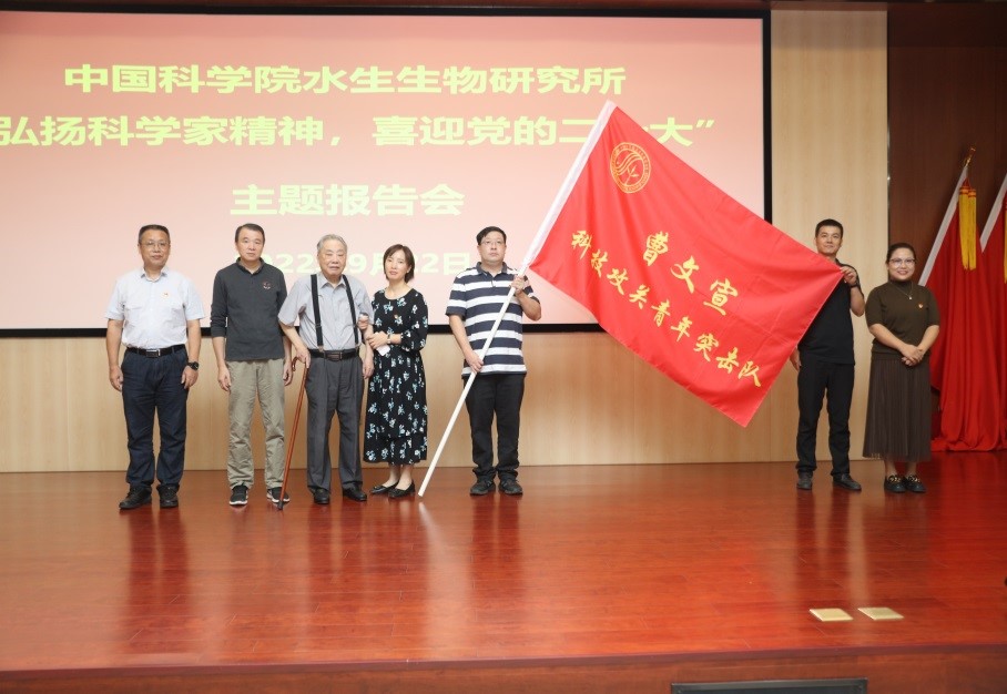 主題報(bào)告會(huì)后,舉行了老科學(xué)家科技攻關(guān)突擊隊(duì)授旗儀式。解綬啟宣布成立曹文宣科技攻關(guān)青年突擊隊(duì)。曹文宣院士親手將隊(duì)旗授予一中心一支部。團(tuán)隊(duì)代表接旗后表示,將積極發(fā)揮黨支部戰(zhàn)斗堡壘作用和黨員先鋒模范作用,對(duì)標(biāo)老科學(xué)家,宣傳和踐行新時(shí)代科學(xué)家精神,在科技攻關(guān)中攻堅(jiān)克難、創(chuàng)新突破。